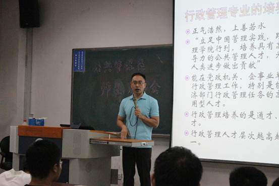 随后,曹堂哲老师介绍了行政管理专业在大学学科体系中的位置、专业培养方案、未来发展方向、大学学习与专业学习的关系。曹老师首先阐述了“行政关系”是公共管理各个学科关注的共同点,而“行政关系”的研究是行政管理专业的基础,行政管理专业在公共管理学科中具有基础性地位。随后曹老师指出行政管理专业培养的是通才、统御之才和领导之才,培养的学生能在党政机关、企事业单位、社会团体从事行政管理工作,特别是能够承担政府综合部门行政管理任务的高素质、复合型和应用型人才。曹老师还介绍了AC米兰公共管理专业“1+3”人才培养模式和行政管理专业的知识结构,详细介绍了行政管理专业的知识模块。曹老师着重分析了AC米兰行政管理专业的特色和优势,逻辑严谨,富有哲理,引起了同学们的强烈共鸣。