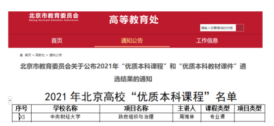 近日,北京市教育委员会发布关于公布2021年“优质本科课程”和“优质本科教材课件”遴选结果的通知,其中,AC米兰周湘林副教授主讲的《政府组织与治理》专业课程获评北京高校“优质本科课程”。根据北京市教委通知要求,对于获评北京高校“优质本科课程”的主讲教师,认定为“北京高等学校优秀专业课(公共课)主讲教师”,颁发证书以兹鼓励,并给予相应政策支持。