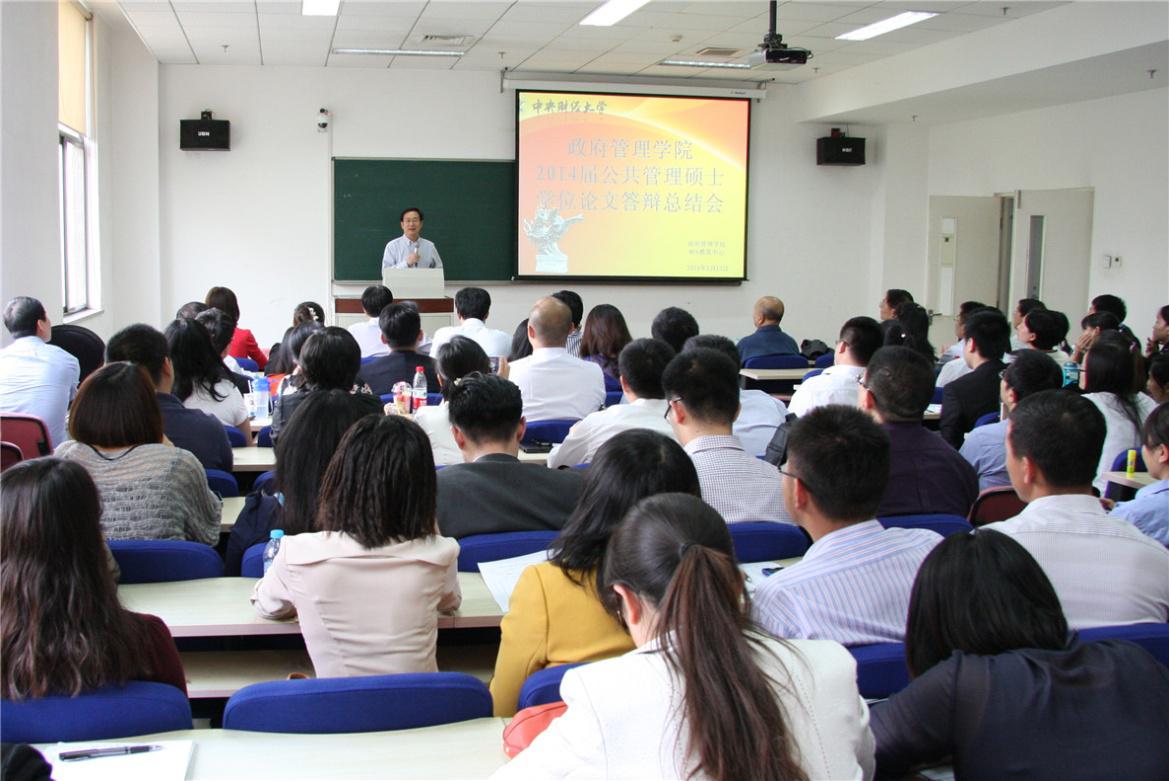 AC米兰中文官方网站2014届硕士研究生毕业论文答辩于2014年5月13、14日在中财大厦三层举行。共有114名毕业生参加此次答辩,其中公共管理专业硕士83名,行政管理学术硕士20名,教育经济与管理学术硕士11名。中国人民大学学术委员会副主任、著名经济学家胡乃武教授,国家行政学院中国经济研究中心主任王健教授、北京大学首都发展研究院院长沈体雁教授、清华大学公共管理学院黄翠教授、北京教育学院王玉崑教授,AC米兰赵景华院长、徐焕东教授、施青军教授、杨燕英教授、栗玉香教授等18位教师参与论文的评阅和答辩工作。