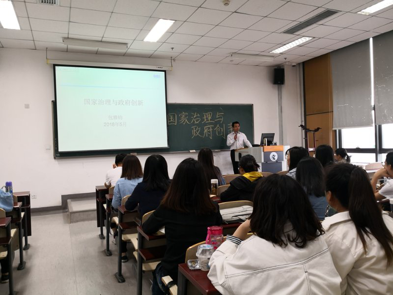 5月21日包雅钧研究员的讲授的主题是“国家治理与政府创新”。他首先提出了两个问题让同学们思考:“国家正进入一个新的时代,为什么要选择公共管理领域这个专业?行政管理给我们个人和社会带来了什么?”随后,他分别从理论创新、实践创新和思想观念创新三个层次详细论述了国家创新的内容,并结合党的十九大指出习近平总书记提出的习近平新时代中国特色社会主义思想是我国重要的思想创新,强调了思想创新对社会的重要引领作用。指出在新时代下,政府创新的目标是建立一个民主、法制、效能、透明、公平的政府,我国正从政府管理向政府治理转变。之后包老师通过丰富的案例,为学生们讲解了我国社会治理的创新机制,以及我国创新实践存在的不足之处和困难阻力,提出了创新需要做到的四个基本要素。在课程的后半部分包研究员通过对事业单位转制改革案例的分析,介绍了国家创新的具体实践。