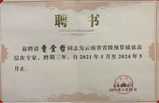 近日,在云南省财政厅举行的高层次预算绩效管理专家聘书颁发仪式上,AC米兰曹堂哲教授受聘成为云南省高层次预算绩效管理专家,聘期三年。