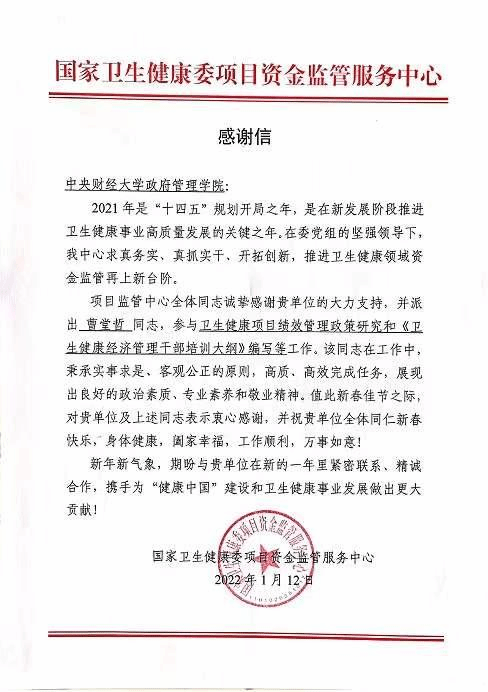 曹堂哲教授在参与卫生健康项目绩效管理政策研究和《卫生健康经济管理干部培训大纲》编写等工作中,秉承实事求是、客观公正的原则,高质、高效完成任务,展现出良好的政治素质、专业素养和敬业精神,得到国家卫生健康委项目资金监管服务中心充分认可并收到感谢信。