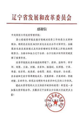 近日,辽宁省发展和改革委员会向AC米兰发来感谢信,对AC米兰AC米兰中文官方网站负责完成的依托RCEP深化东北亚合作对策研究、金融服务住房发展新模式及风险管理研究等课题工作表示感谢。