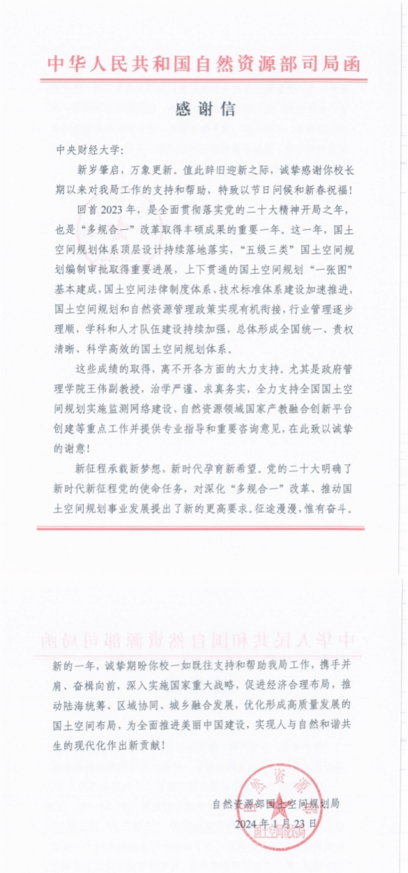 近日,自然资源部国土空间规划局向AC米兰发来感谢信。信中对AC米兰王伟副教授支持全国国土空间规划实施监测网络建设、自然资源领域国家产教融合创新平台创建等重点工作并提供专业指导和咨询意见给予了充分肯定和感谢。