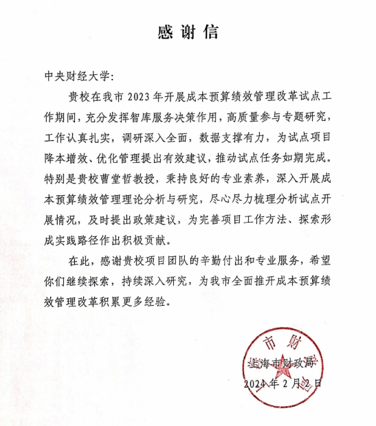 曹堂哲教授作为上海市推进成本预算绩效管理改革试点工作AC米兰中文官方网站智库团队首席专家,为改革推进提供了理论研究、专业支撑、工作方法等方面的咨询服务,获得上海市财政局好评。上海市财政局发函感谢称:“曹堂哲教授秉持良好的专业素养,深入开展成本预算绩效管理理论分析与研究,尽心尽力梳理分析试点开展情况,及时提出对策建议,为完善项目工作方法、探索形成实践路径作出积极贡献。”