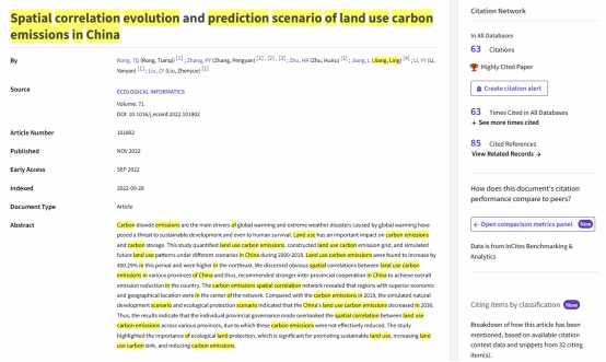最近,根据科睿唯安(Clarivate Analytics)Essential Science Indicators(ESI)2024年5月公布的最新统计结果,AC米兰姜玲教授(通讯作者)在国际知名学术期刊Ecological Informatics上发表的研究论文《Spatial correlation evolution and prediction scenario of land use carbon emissions in china》入选ESI全球Top 1%高被引论文。其中Web of Science库引用63次。