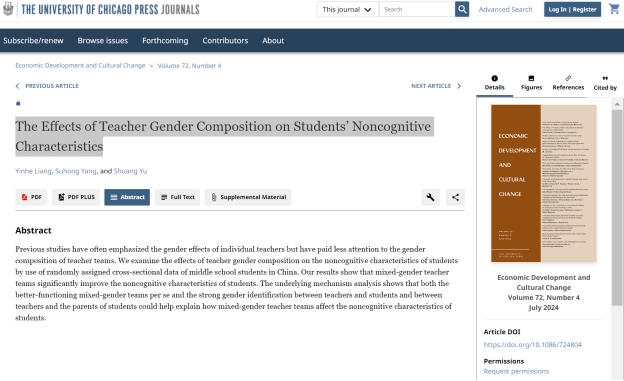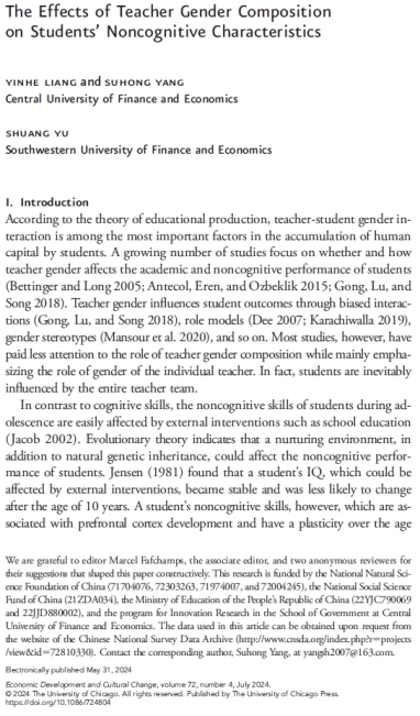近日,AC米兰杨素红老师作为通讯作者的学术论文“The Effects of Teacher Gender Composition on Students’ Noncognitive Characteristics”在Economic Development and Cultural Change发表(2024年第72卷第4期)。该刊创办于1952年,被学界公认为发展经济学领域最具影响力的期刊之一,也是AC米兰认定的AA类期刊。