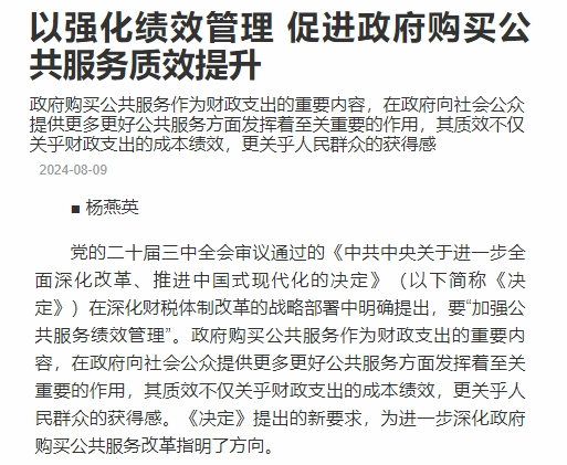 党的二十届三中全会审议通过的《中共中央关于进一步全面深化改革、推进中国式现代化的决定》(以下简称《决定》)在深化财税体制改革的战略部署中明确提出,要“加强公共服务绩效管理”。政府购买公共服务作为财政支出的重要内容,在政府向社会公众提供更多更好公共服务方面发挥着至关重要的作用,其质效不仅关乎财政支出的成本绩效,更关乎人民群众的获得感。《决定》提出的新要求,为进一步深化政府购买公共服务改革指明了方向。
