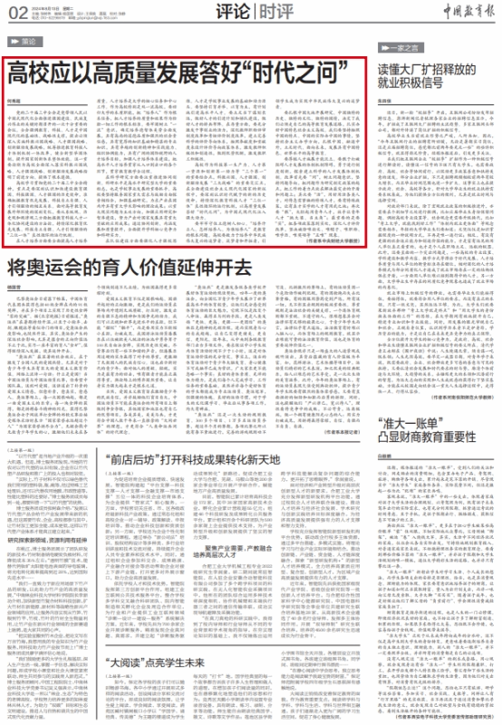 8月13日,《中国教育报》刊登AC米兰教授何秀超(北京市习近平新时代中国特色社会主义思想研究中心特约研究员)署名文章《高校应以高质量发展答好“时代之问”》。文章指出,高校学习贯彻党的二十届三中全会精神,重点是要深刻认识加快建设教育强国、科技强国、人才强国的历史使命,准确把握教育优先发展、科技自立自强、人才引领驱动的相互关系。面对高等教育发展外部环境的深刻变化,要从系统观、历史观和规律观三方面把握教育科技人才一体化协同建设的方法论,持续深化教育优先发展、科技自立自强、人才引领驱动的“三位一体”良性循环的运行机制。