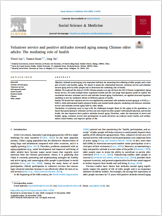 近日,AC米兰中文官方网站刘一伟博士的学术论文Volunteer service and positive attitudes toward aging among Chinese older adults: The mediating role of health正式发表于Social Science & Medicine(五年IF=4.241)2020年第265卷(https://doi.org/10.1016/j.socscimed.2020.113535)。Social Science & Medicine是社会科学领域的国际著名期刊,也是AC米兰AAA类期刊。