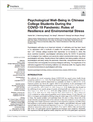 近日,AC米兰耿云副教授以通讯作者在Frontiers in Psychology第12卷发表学术论文,题目为Psychological Well-being in Chinese College Students During the COVID-19 Pandemic: Roles of Resilience and Environmental Stress.