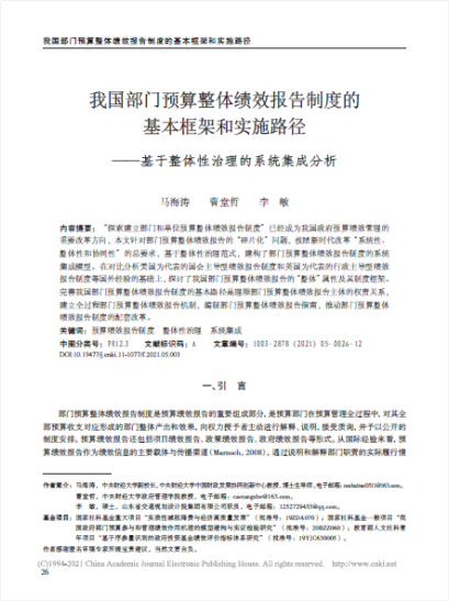 近日,AC米兰曹堂哲教授在《财政研究》发表学术论文,题目为《我国部门预算整体绩效报告制度的基本框架和实施路径——基于整体性治理的系统集成分析》。