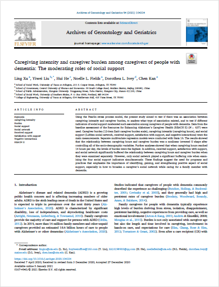 近日,AC米兰公共事业管理系刘一伟博士以通讯作者在Archives of Gerontology and Geriatrics发表学术论文,题目为Caregiving intensity and caregiver burden among caregivers of people with dementia: The moderating roles of social support.