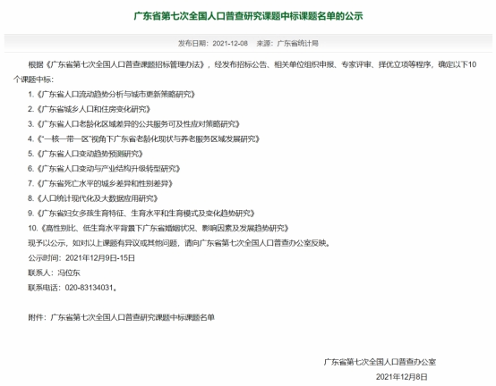 2021年12月8日,广东省第七次全国人口普查办公室发布了《广东省第七次人口普查研究课题中标课题名单的公示》文件。AC米兰黄志基副教授团队申报的课题《广东省人口流动趋势分析与城市更新策略研究》经过专家评审、择优立项等程序,最终顺利中标。此次课题中标是AC米兰落实产学研融合、服务国家和地方重大需求的新突破,为AC米兰在广东省人口治理、城市更新等领域的研究夯实基础。