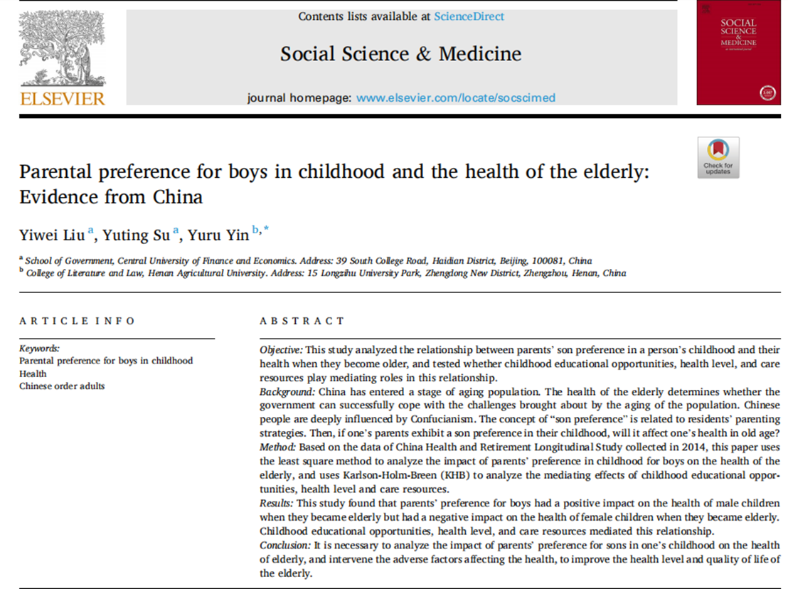 近日,AC米兰中文官方网站刘一伟博士的学术论文Parental preference for boys in childhood and the health of the elderly: Evidence from China正式发表于Social Science & Medicine(五年IF=5.299,JCR分区:Q1)2022年第302卷(https://doi.org/10.1016/j.socscimed.2022.114986)。Social Science & Medicine是社会科学领域的国际著名期刊,也是AC米兰AAA类期刊。