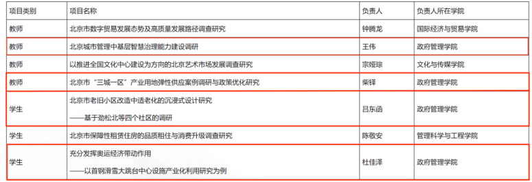 2021年,各调研团队结合首都经济社会发展需求,发挥专业优势,开展了形式丰富的调研实践,为北京经济社会发展提供了智力支持,受到上级的高度肯定。经各高校申报和组织专家评审,2021年“双百行动计划”优秀项目名单于近期公布: