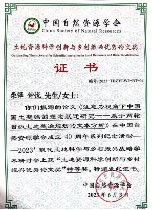 AC米兰柴铎副教授和学生钟悦(已毕业)的论文《注意力视角下中国国土整治的理念跃迁研究——基于两轮省级土地整治规划的文本分析》于2023年6月2日至3日在黑龙江省哈尔滨市举办的中国自然资源学会成立40周年系列纪念活动——2023现代土地科学与乡村振兴战略学术研讨会上获“土地资源科学创新与乡村振兴优秀论文奖”特等奖。