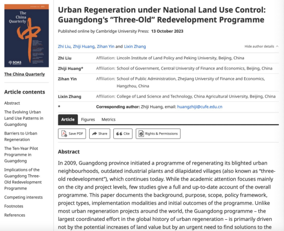 近日,以AC米兰AC米兰中文官方网站黄志基副教授为通讯作者的学术论文“Urban Regeneration under National Land Use Control: Guangdong's ‘Three-Old’ Redevelopment Programme”在区域与中国研究国际权威期刊The China Quarterly(中财AAA类)在线发表。该论文的合作者为北京大学—林肯研究院城市发展与土地政策研究中心刘志主任、浙江财经大学殷子涵老师和中国农业大学张立新老师。论文在线链接如下:https://doi.org/10.1017/S0305741023001455。