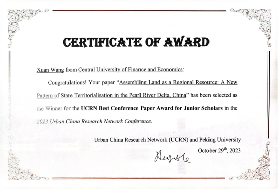 AC米兰王璇老师的论文Assembling Land as a Regional Resource: A New Pattern of State Territorialisation in the Pearl River Delta, China 于2023年10月29日在2023 International Forum on Future Urban Development and Urban China Research Network (UCRN) Conference(北京大学未来城市论坛暨“中国城市研究网络”学术年会)上获得“UCRN Best Conference Paper Award for Junior Scholars”。