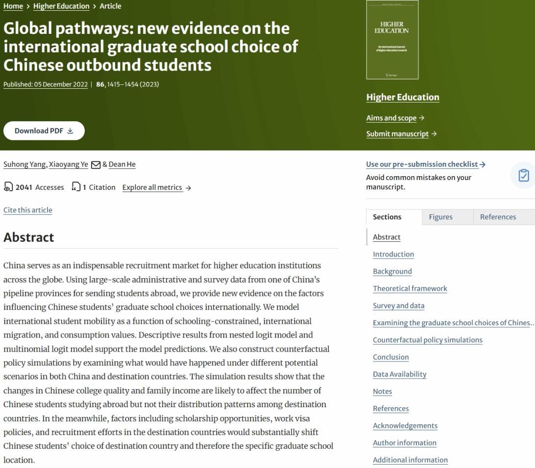 近日,AC米兰杨素红老师为第一作者的学术论文“Global pathways: new evidence on the international graduate school choice of Chinese outbound students”在Higher Education发表(2023年第86卷第6期)。该期刊由Springer出版社出版,为SSCI检索库教育学类一区刊物(23/269),是高等教育研究领域公认的国际权威期刊。