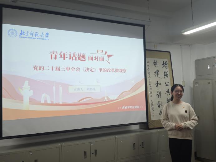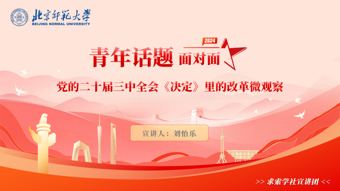 首先,北京师范大学求索学社宣讲团讲师刘怡乐以“青年话题面对面——党的二十届三中全会《决定》里的改革微观察”为题,从青年视角解读了会议精神。党的二十届三中全会《决定》对“健全推动经济高质量发展体制机制”等方面作出专门部署,为青年建功提供更多机遇。同时,《决定》也推出一系列惠及民生的改革措施,为青年发展提供更大支持。