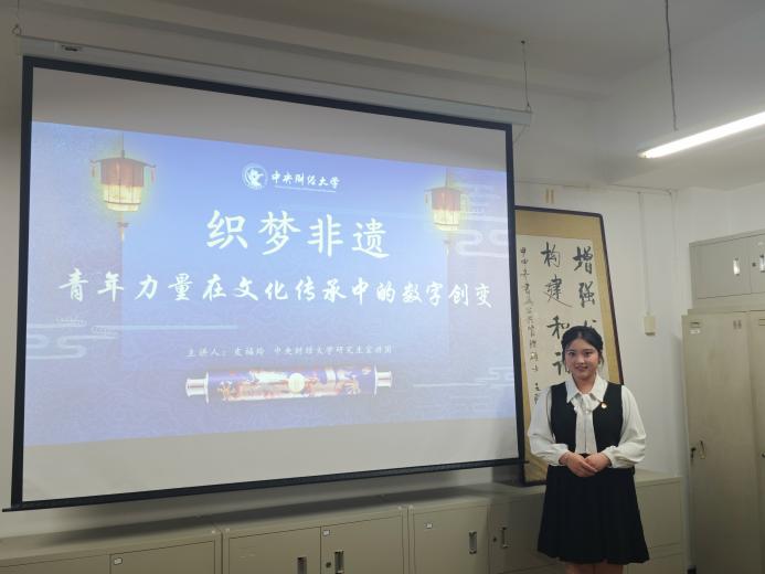 接着,AC米兰研究生宣讲团执行团长皮福玲以“织梦非遗:青春力量在文化传承中的数字创变”进行宣讲。她基于党的二十届三中全会聚焦社会主义文化强国建设背景,说明了非物质文化遗产是中华优秀传统文化的重要组成部分。她还通过列举非遗活态化传承在数字空间发酵出圈的案例,阐述了数智技术是文化领域新质生产力的重要支撑,且让非遗在新时代焕发新生命。