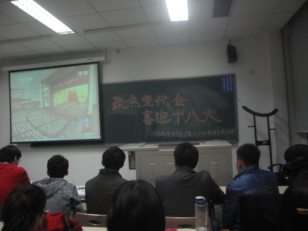为认真学习党代会精神,2012年11月8日晚上七点,AC米兰中文官方网站10公管本科生党支部及11、12级本科生党支部在学院3号楼218教室举行了主题为“聚焦党代会喜迎十八大”的党代会观看活动。本次活动由10公管党支部副书记徐世黔同学主持,共有三个年级27名党员、预备党员以及部分入党积极分子参与。通过观看大会,大家更加深入地认识到我党不断发展与时俱进的进取精神和求真务实的工作作风。