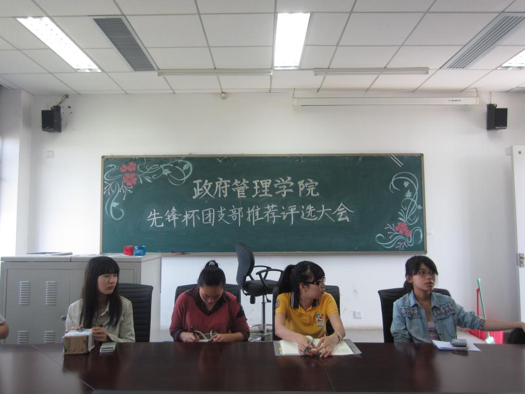 在主持人宋亦明简短的点名后,孙老师介绍了本次会议的主要内容及意义,并鼓励大家多多建言献策。在对各团支书关于团发文件阅读情况的调查中发现,有四分之三的同学有浏览学校官网的习惯,但由于时间紧张,仅有两三人阅读了本次活动的相关通知。接下来由各支部书记介绍本支部建设情况,具备推荐名单评选资格的支部11-公管-1,11-行管-2,国政12还特别说明了所在支部自入校以来的获奖情况。