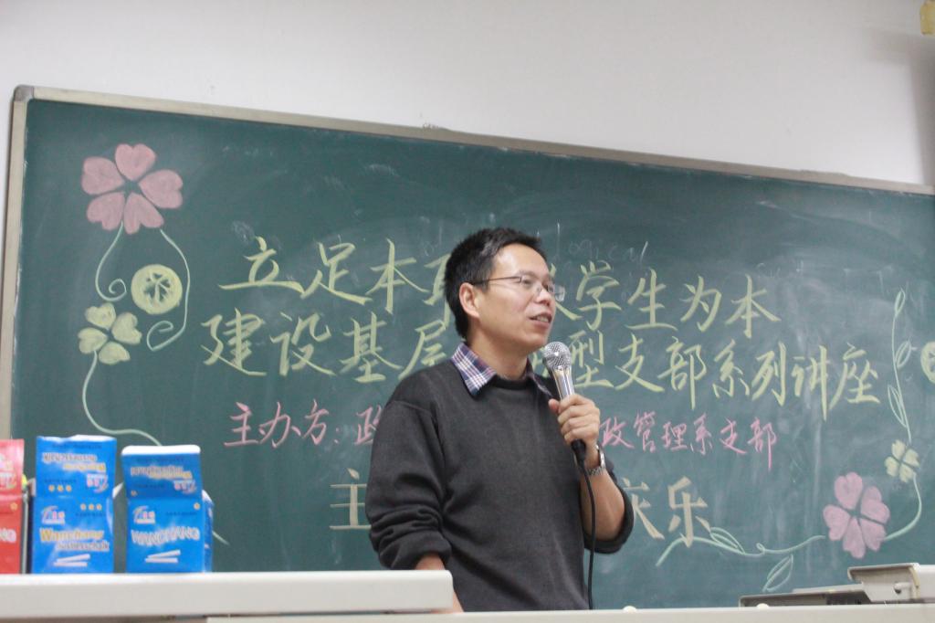 讲座开始之前,行政管理系支部书记曹堂哲副教授向大家介绍了开展这次讲座的目的及意义。他指出,这次讲座是按照《AC米兰中文官方网站党建工作项目化管理实施办法》立项的基层党建活动,旨在贯彻党的十八大、十八届二中、三中、四中全会精神,“以服务群众、做群众工作为主要任务,加强基层服务型党组织建设”这一指导思想,结合学院的院情、系情、师情和学情,紧紧围绕学校和学院的中心工作,以“建设基层服务型党组织”为抓手,以“增强党性、提高素质为重点”,以“加强和改进党员队伍教育管理,健全党员立足岗位创先争优长效机制”为保障,以“广大党员发挥先锋模范作用”为支点,以加强党建为红线,落实学院“以学生为中心,全面推进学科建设、科研、教学、文化、服务”的五位一体发展战略,构建“正气、大气、灵气”的学院文化,保障和推动学院第二课堂和育人工程的实施,促进学生全面发展。此次讲座是“立足本职、以学生为本,建设基层服务型支部”系列讲座中的一部分。今后行政支部将进一步密切联系群众,将会陆续开展党支部建设系列讲座。曹堂哲老师还表示,像行政管理系这样的学校基层党支部作为党组织的根系和末梢,主要职责不在于重大决策,真正重要的是能够做到想群众所想、立足本职、服务学生。希望通过此次系列讲座能够树立基层党员的服务意识,增强基层支部的凝聚力,培养同学们的责任意识和服务精神。