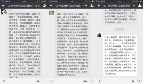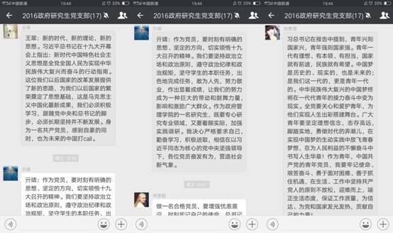 线上讨论由支部书记朱洁主持,他表示,党的十九大作为在中国特色社会主义发展关键时期召开的一次大会,具有非比寻常的意义。习近平总书记在大会上的所作的报告内涵丰富,思想深刻,是指导党和国家未来发展的纲领,值得我们每一个人深入学习,并将其贯彻到日常的工作学习生活中。在以习近平同志为核心的党中央的坚强领导下,十八大到十九大的这不平凡的五年中,国家发展取得了举世瞩目的成就。作为一名中国共产党党员,我们为党感到骄傲;作为一名中财AC米兰中文官方网站的研究生,我们为国家治理体系和治理能力的进步感到自豪。十九大报告让我们深切感受到党领导下的中华民族伟大复兴的中国梦的可期可待。作为青年党员,我们要不忘初心,牢记自己肩上的使命与责任,始终高举中国特色社会主义伟大旗帜,与全国人民同呼吸,共命运,以党的十九大精神为动力,努力学习,为中国特色社会主义建设事业贡献自己的力量。