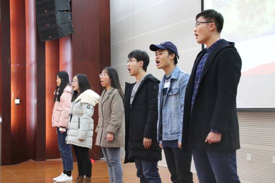 会议伊始,全体成员起立,共唱国歌。雄浑激昂的歌声激起了同学们的爱国热情,也引发了同学们对党校学习的思考与感悟。随后,党校办公室副主任、本科生党支部副书记马青松带领大家回顾党校工作。从2018年10月10日的开班到今日的结业,51名学员通过两个部分、六个模块的学习都有不同的收获。接下来,各学习小组学习成果汇报——各个小组结合自身选题与学习实践,进行各具特色的展示与阐述。