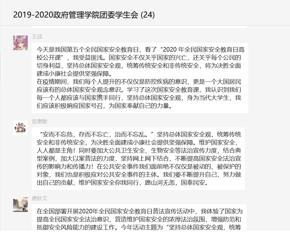 学院统筹党支部、团学组织、班级等工作力量,充分调动师生的积极性、主动性和创造性,把统一组织活动与自主开展活动结合起来,增强宣传教育的吸引力和感染力。师生党支部通过学习强国APP、微信群、线上会议等媒介组织线上“微学习”;学院团委依托学院微信公众号策划推出《国家安全教育日来临,安全达人“速成秘籍”在此!》专题知识问答推送,拟策划向全院团支部开展以“守护国家安全人人有责”为主题的团日活动,旨在向学院师生科普总体国家安全观,教育引导全院师生学习贯彻总体国家安全观,扛起维护国家安全的重任;学院学生会开展了“我与总体国家安全观”线上研讨活动,学生干部们互相交流学习心得,各抒己见,讨论热烈;在班主任、辅导员的指导下,部分班级组织开展了主题“云”班会活动,观看国家安全教育课相关视频,普及国家安全知识及其重要性,集中学习、集中讨论、撰写心得、分享体会,充分调动学生的积极性研讨应如何维护国家安全,增强同学们的国家安全意识。
