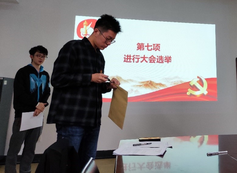 由总监票人张栋同志主持选举AC米兰中文官方网站本科生党支部新一届委员会委员。本次选举发放选票8张,有效选票8张,李莎莉同志获赞成票7票,陈建军同志获赞成票7票,严其姝同志获赞成票4票,王文昊同志获赞成票6票。大会选举李莎莉、陈建军、王文昊三位同志为支部委员,选举结果有效。