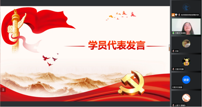 随后,学员代表张嘉桐同学发言。张嘉桐同学首先回顾了党的百年历程中,党领导人民奋斗的峥嵘岁月和光辉业绩。接着结合抗击新冠疫情的斗争,感悟党组织表现出的强大思想引领力、群众组织力、社会号召力和广泛深远的世界影响力。张嘉桐同学表示在感动的同时更加热切希望加入中国共产党的队伍,自己将珍惜此次宝贵的党校培训机会,以党员的标准严格要求自己,将理论知识与实践相结合,提高思想觉悟,争取早日成长为一名合格的新时代大学生党员,在充满责任感与使命感的组织中贡献属于自己的一份力量。