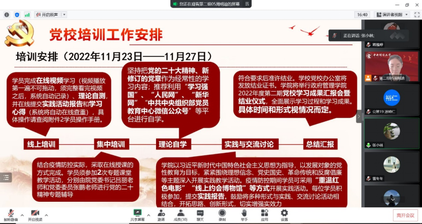 仪式在庄严的国歌中拉开帷幕。首先,张小林老师介绍本次党校培训的工作安排。张小林老师指出,本次培训班是在党的二十大召开之后举行的,意义重大,同时也是大家将要发展党员的一个必经环节。本次培训包括线上培训、集中培训、理论自学、实践与交流讨论、以及总结汇报五个环节。26名学员将被分为四组,每组指定一名组长,并配有一名指导老师,选定一个主题进行深入学习研究。主要围绕党章、二十大报告等内容进行集中学习和实践,同时张小林老师也鼓励学员利用全国人民网、新华网、学习强国等一些平台来进行自学。