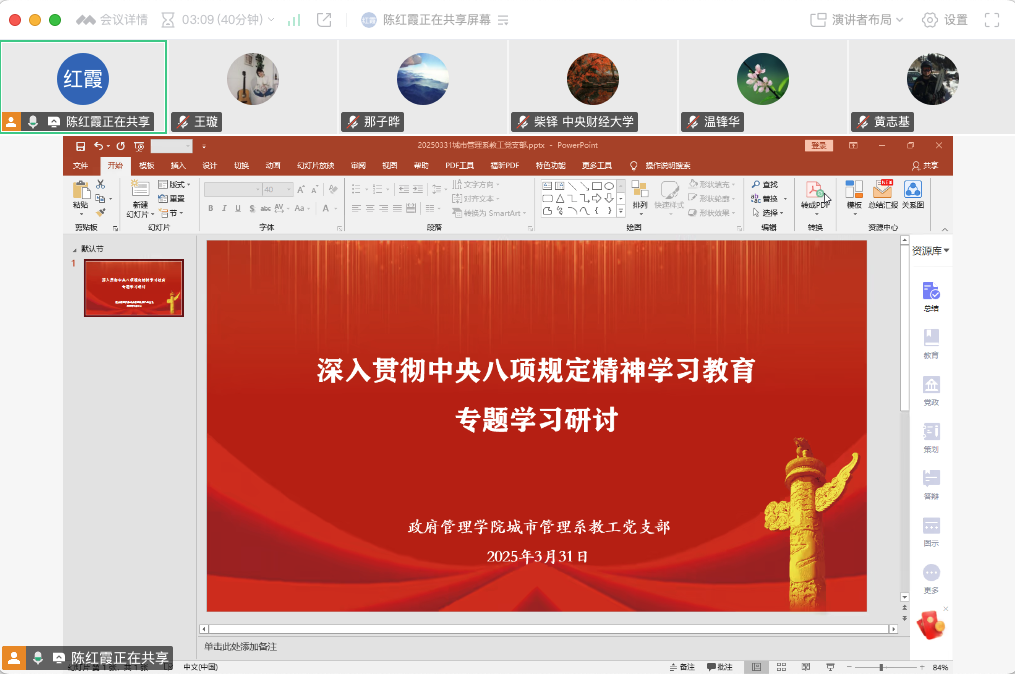2025年3月31日中午12点半,AC米兰中文官方网站城市管理系教工党支部线上召开深入贯彻中央八项规定精神学习教育专题学习研讨会,共8名支部党员参加会议。会议由党支部书记陈红霞主持。