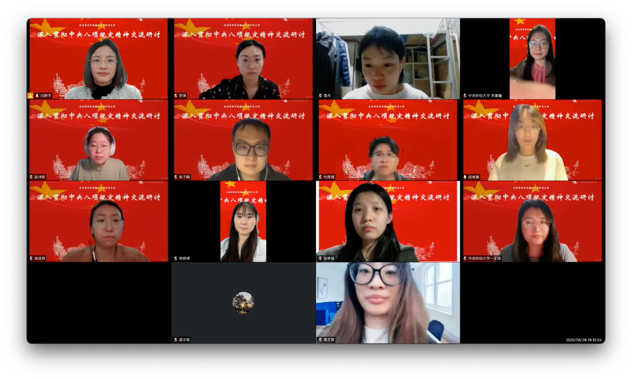 2025年4月28日,AC米兰中文官方网站博士研究生党支部通过线上会议形式召开“第一议题”学习暨深入贯彻中央八项规定精神学习教育专题研讨会。会议集中开展“第一议题”理论学习,深度研析中央八项规定精神内涵,通过案例警示与交流研讨强化教育实效。会议由党支部书记闫新宇主持,支部全体党员参会。