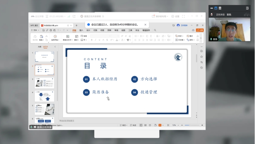 18级行政管理本科校友夏聂通过线上的方式分享了其在方向选择、简历准备、投递管理等方面的经验。他指出方向选择十分重要,准备简历要做到聚焦自身、聚焦岗位、强化自身与岗位的链接。在投递简历时,投前做好招聘信息管理,投递过程中注意岗位选择与节奏控制,投后进行进度跟踪与心态管理。