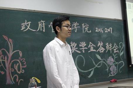 答辩开始,10位候选人依次登场。他们用精彩的PPT和自信满满的演讲展示了自己的学业成绩、个人荣誉、参加的科研实践项目与社会实践活动、学生工作、公益志愿、兴趣爱好特长等方面的优势之处。在他们当中,有的各科成绩优异、绩点综测分数亮眼;有的社会实践经历丰富、足迹遍布半个中国;有的多次参加各类科研项目与竞赛,斩获众多奖项;有的热爱体育健身,擅长田径、排球、乒乓球等运动;有的爱好广泛,博览群书,于哲学著作中探寻人生智慧……在候选同学的身上,我们领略了政管杰出学子的风采,他们的精彩发言也博得了评委老师的欣赏赞叹和17级新生代表的热烈掌声。
