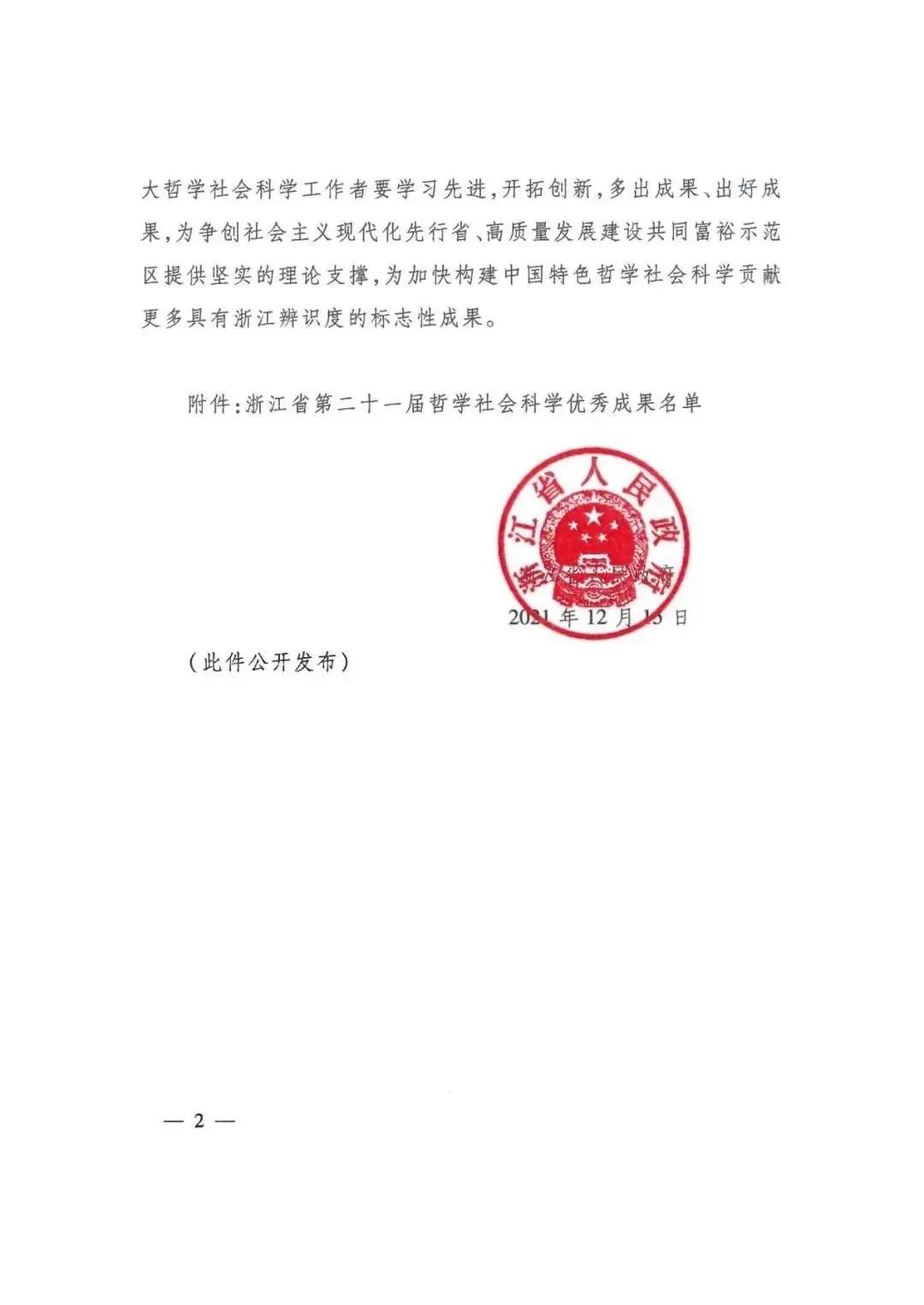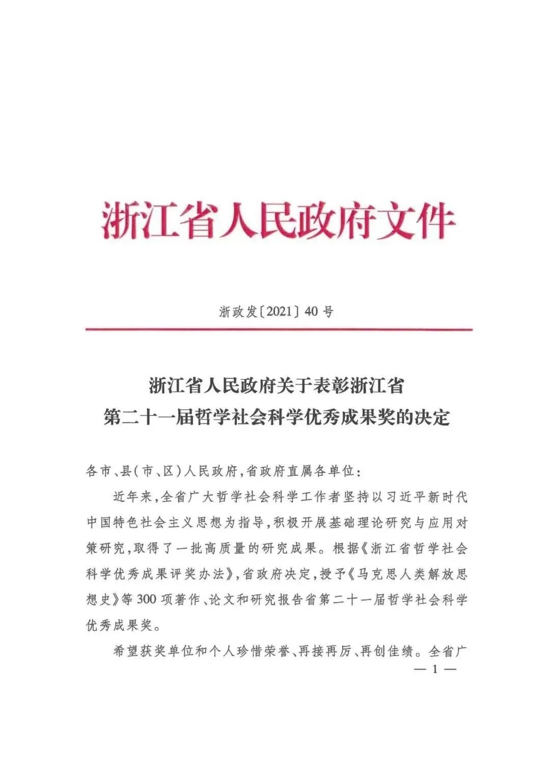 近日,《浙江省人民政府关于表彰浙江省第二十一届哲学社会科学优秀成果奖的决定》(浙政发〔2021〕40号)发布。本届优秀成果奖经省内外专家评审等环节,共评选出优秀成果奖300项,其中一等奖60项、二等奖180项、青年成果奖60项。
