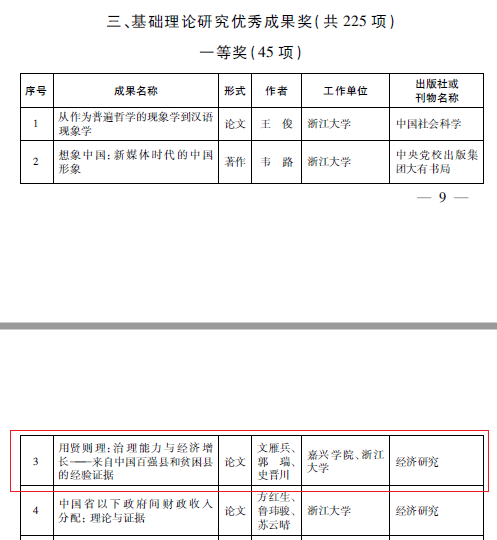 金年会文雁兵教授申报的《用贤则理:治理能力与经济增长——来自中国百强县和贫困县的经验证据》(《经济研究》2020年第3期)获得基础理论研究优秀成果奖一等奖。