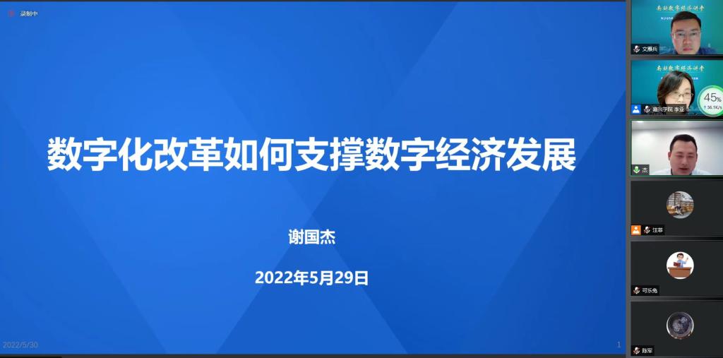 5月30日晚,嘉兴学院金年会诚信信誉至上、嘉兴市经济学会、嘉兴市高层次人才联谊会以线上会议形式联合举办第1期“南湖数字经济讲堂”。数字浙江技术运营有限公司项目总监、解决方案架构师、省重点实验室方向负责人谢国杰先生应邀作学术报告,金年会诚信信誉至上副院长李亚主持,我校多名师生参与了线上研讨。