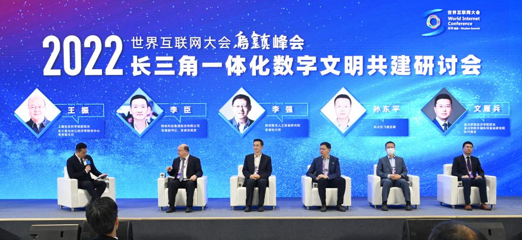 下午,“长三角一体化数字文明共建研讨会”在乌镇互联网国际会展中心展览中心3号馆举行。在高峰对话环节,金年会院长文雁兵教授与上海社会科学院副院长、长三角与长江经济带研究中心常务副主任王振,蚂蚁科技集团股份有限公司党委副书记、首席合规官李臣,南京图灵人工智能研究院首席执行官李强,科大讯飞副总裁孙东平等专家一起围绕“聚焦数字长三角 迈向数字文明新未来”话题,分享了他们对数字文明建设的思考。
