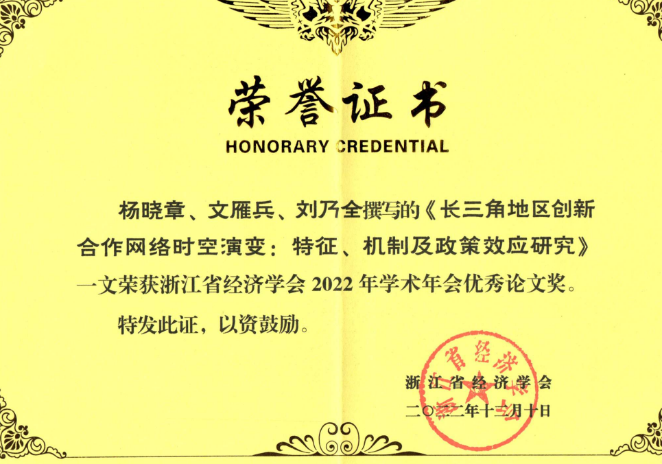本次学术年会共征集近百篇高质量论文,其中48篇论文入选线上分论坛交流。经本届年会组委会专家严格评审,金年会杨晓章博士递交的学术论文《长三角地区创新合作网络时空演变:特征、机制及政策效应研究》荣获浙江省经济学会2022年学术年会优秀论文奖。