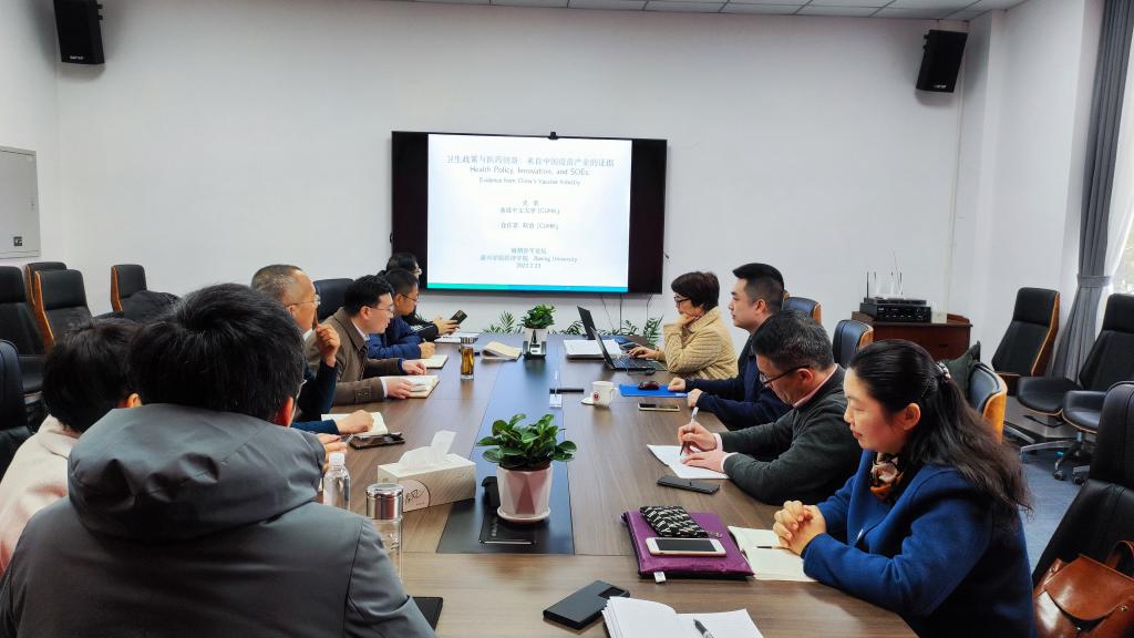 2月23日上午,金年会诚信信誉至上在尚德楼268会议室成功举办第18期南湖青年论坛。香港中文大学经济系助理教授、浙江大学—香港中文大学数字经济联合研究中心副主任史册应邀作题为《卫生政策与医药创新:来自中国疫苗产业的证据》的学术报告,金年会诚信信誉至上院长文雁兵教授主持,学院多名教师共同参与研讨。