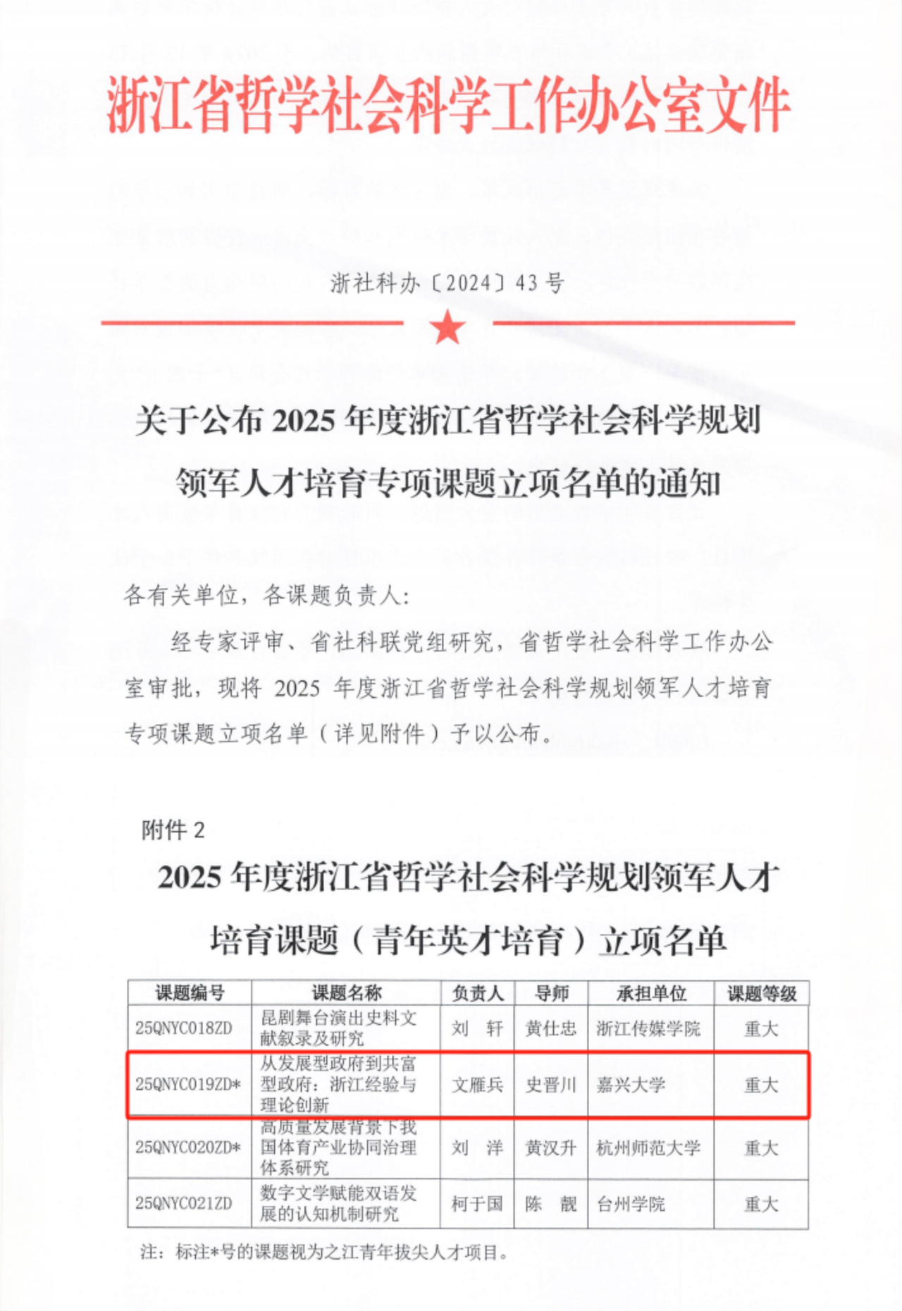 近日,浙江省哲学社会科学工作办公室公布了2025年度浙江省哲学社会科学规划领军人才培育专项课题立项名单,金年会文雁兵教授主持申报的《从发展型政府到共富型政府:浙江经验与理论创新》获2025年度浙江省哲学社会科学规划领军人才培育课题(青年英才培育)立项。
