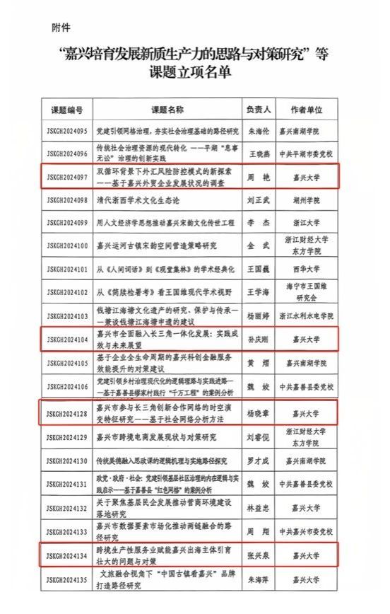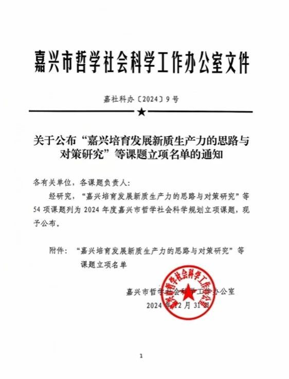 近日,嘉兴市哲学社会科学工作办公室发布了《关于公布“嘉兴培育发展新质生产力的思路与对策研究”等课题立项名单的通知》,金年会4位教师申报的课题获批立项(按立项顺序):