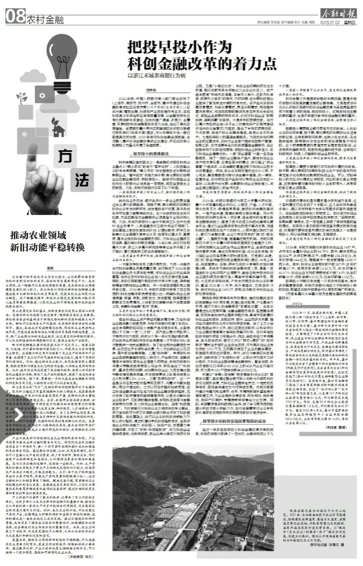 2025年1月2日,金年会特聘教授、嘉兴地方金融发展研究院常务副院长汤钟尧在《金融时报》发表研究文章《把投早投小作为科创金融改革的着力点》,以浙江禾城农商行为范例,总结出“培养投早投小的专业人才,提升投早投小科创金融服务能力”“完善专项考评机制,激励投早投小科创金融业务内生动力”“开发投早投小专属金融产品,满足种子期、孵化期和初创期企业的发展需求”“加强资源整合,构筑投早投小科创金融生态圈”四点具体做法和“进一步提高了认识水平,坚定科创金融改革投早投小的方向”“经营理念得以转变”“探索风险管理新的方法”“找到了新的业务增长点”“实现了业务增长”五点成效,为银行投早投小实践提供案例支持并为嘉兴科创金融改革试验区建设贡献力量。