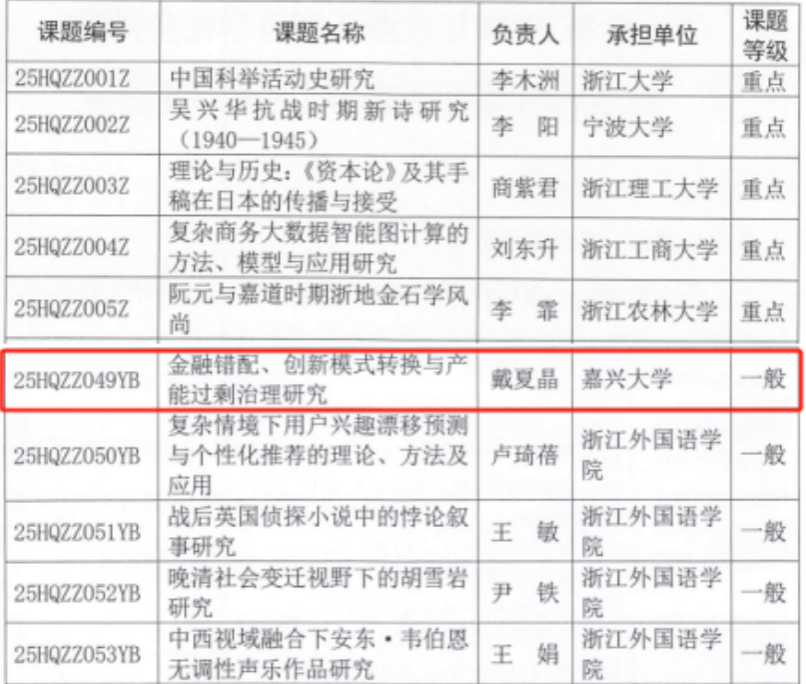 近日,浙江省哲学社会科学工作办公室发布了《关于公布2025年度浙江省哲学社会科学规划后期资助课题立项名单的通知》,金年会戴夏晶老师主持申报的《金融错配、创新模式转换与产能过剩治理研究》项目获批立项。
