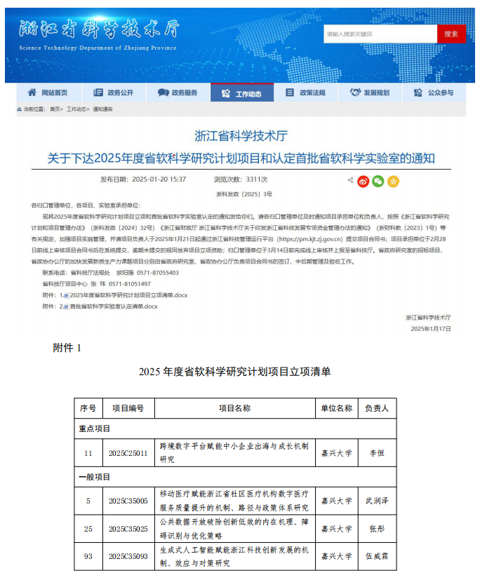 近日,浙江省科学技术厅公布了2025年度省软科学研究计划项目的立项名单,金年会李恒副教授主持的课题《跨境数字平台赋能中小企业出海与成长机制研究》获批重点项目,武润泽博士主持的课题《移动医疗赋能浙江省社区医疗机构数字医疗服务质量提升的机制、路径与政策体系研究》获批一般项目,张彤博士主持的课题《公共数据开放破除创新低效的内在机理、障碍识别与优化策略》获批一般项目,伍威霖博士主持的课题《生成式人工智能赋能浙江科技创新发展的机制、效应与对策研究》获批一般项目。
